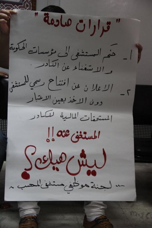 وقال سعيد ارزيقات اختصاص أشعة سابق في مستشفى المحتسب_جمعية أهل الخير_، أن 78 موظفا لم يتقاضوا رواتب خمسة شهور قبل فصلهم عندما تم اعلان مستشفى محمد علي المحتسب مستشفى حكوميا بدلا عن جمعية كما كانت في فترة توظيفهم.