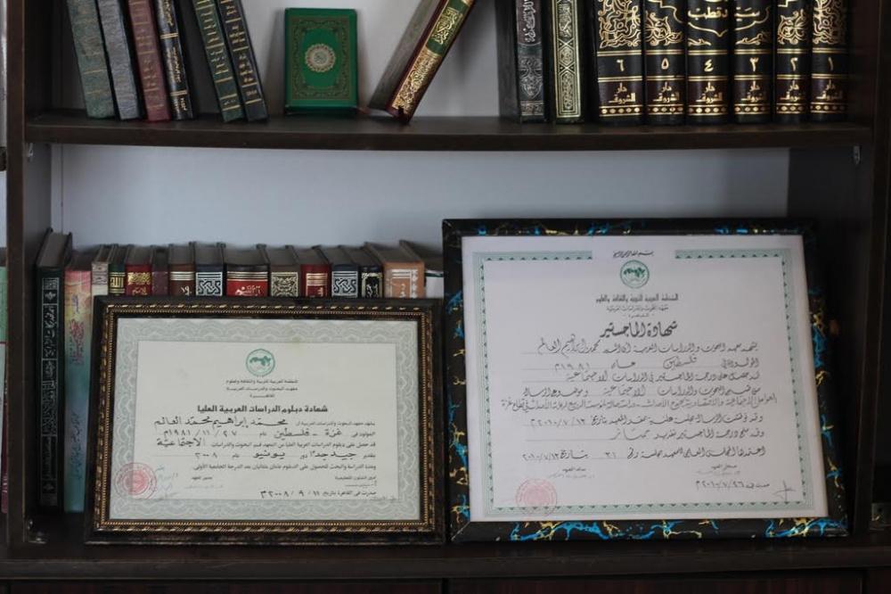 لم يتردد محمد العالم، دكتور علم الاجتماع الجنائي، كثيراً في اتخاذ أصعب قرار قد يتخذه أكاديمي مثله يوماً؛ أن يعلق شهادته العليا على الجدار فيما يتعلم صنعة "البناء" من أجل مواجهة مصاعب ومتطلبات الحياة والهروب من شبح البطالة المتفاقمة في قطاع غزة، علًه يتعلم بناء جدران تحطمت عليها طموحاته وأحلامه.