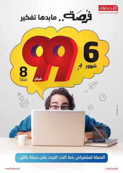 أعلنت شركة حضارة للإستثمار التكنولوجي إحدى شركات مجموعة الاتصالات الفلسطينية عن إطلاق حملتها الجديدة بعنوان "فُرصة..ما بدها تفكير" في الضفة الغربية وقطاع غزة لمشتركي خط النت الجدد على حملة بالتل.