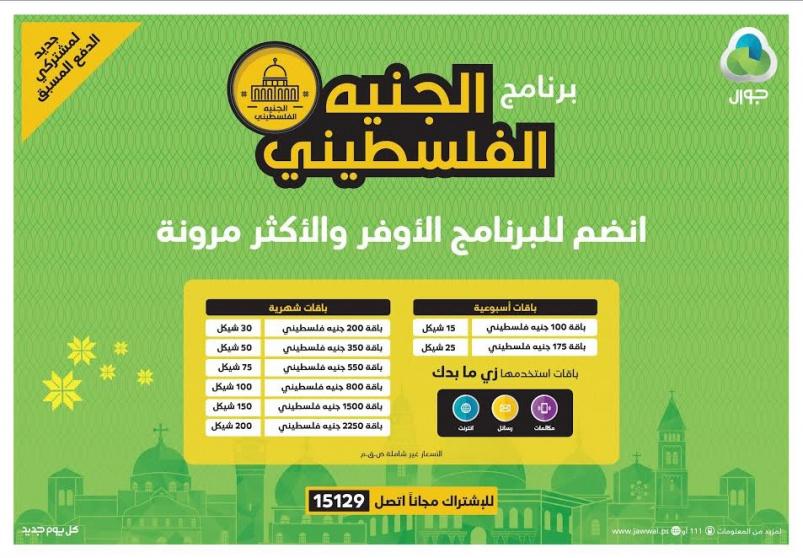 ويعد برنامج "الجنيه الفلسطيني" الأوفر على الإطلاق وذلك بتقديمه لباقات أسبوعية وشهرية يكون للمشترك حرية استخدامها سواء كانت مكالمات أو رسائل لكل الشبكات المحلية والدولية، انترنت، تجوال محلي أو بالأردن.