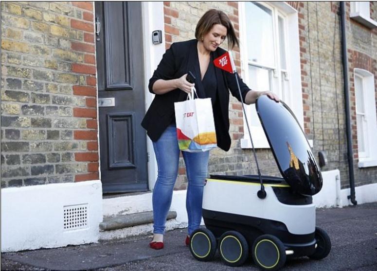 ونشر موقع "جست إيت" Just Eat، المتخصص في تسويق الوجبات الجاهزة عبر الإنترنت، فيديو يظهر أول سيدة في العالم تتسلم وجبة "تيك أواي" جاهزة عبر الديليفري بواسطة الروبوت، وهو الإنجاز الذي يتوج تجارب استغرقت عدة أشهر، أجرتها "جست إيت" بالتعاون مع "روبو كوريير" على روبوت الديليفري.