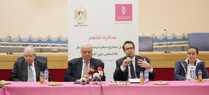وقد جاء توقيع هذه المذكرة، انطلاقاً من ايمان الطرفين بضرورة العمل على التخفيف من حدة البطالة في صفوف فئة الاشخاص ذوي الإعاقة، والتي تجاوزت نسبتها في فلسطين (87.3%)، حيث بلغت النسبة في الضفة الغربية (85.9%)، وفي قطاع غزة (90.9%). حيث تعتمد الفكرة الأساسية في تشغيل المتعطلين عن العمل وأصحاب الأفكار الريادية من ذوي الاعاقة على المشاريع الصغيرة الناشئة ومتناهية الصغر إتاحة الفرصة لتواصل أصحابها من هذه الفئة مع بنك فلسطين.