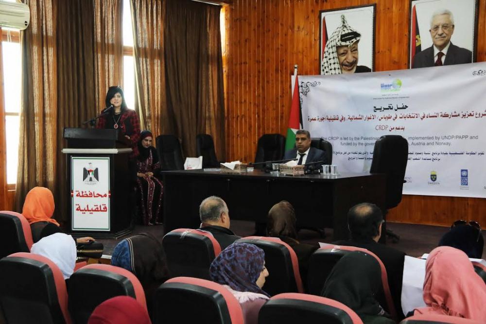 نظمت مؤسسة حوار للتنمية المجتمعية حفل تخريج واختتام مشروع تعزيز مشاركة النساء في الانتخابات المحلية والذي تم تنفيذه من قبل برنامج الأمم المتحدة الإنمائي/ برنامج مساعدة الشعب الفلسطيني والممول من حكومات السويد والنمسا والنرويج، وذلك في دار محافظة قلقيلية.