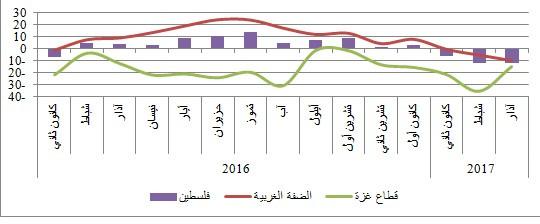 وعلى العكس من ذلك، ارتفع المؤشر في قطاع غزة عن المستويات الدنيا التي وصلها الشهر السابق، مسجّلاً نحو -14.8 نقطة مقارنة بحوالي -35.1 نقطة في شباط الماضي. يأتي ذلك على خلفية نمو مؤشرات جميع الأنشطة الصناعية، باستثناء تراجع طفيف في مؤشر صناعة البلاستيك. وشهدت بعض الأنشطة تحسّناً ملموساً، يأتي في مقدمتها تحسّن مؤشر الصناعات الإنشائية الذي يمتاز بتقّلبه الشديد تبعاً لتدفق المواد الخام اللازمة للبناء في القطاع.