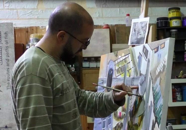 "إحنا هون بالضبط زي سمكة السردين؛ كنا من أهل الساحل حدودنا السما وهلا بهالعلبة حتى النفس محسوب علينا" قال البابا بينما يتخذ من إحدى زوايا مرسمه المكتظ هو الآخر بالألوان واللوحات والأفكار. لقد استطاع علاء إقناع والدته بشكل من الأشكال، بمنحه هذه الغرفة من المنزل الصغير أصلاً لتصبح فيما بعد كل عالمه منذ 12 عاماً.