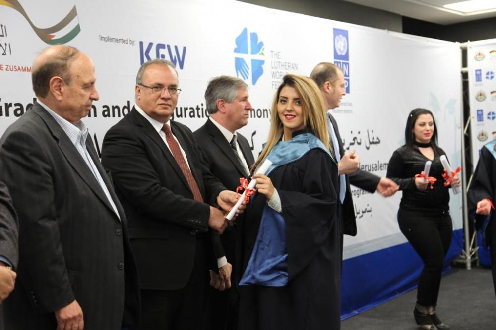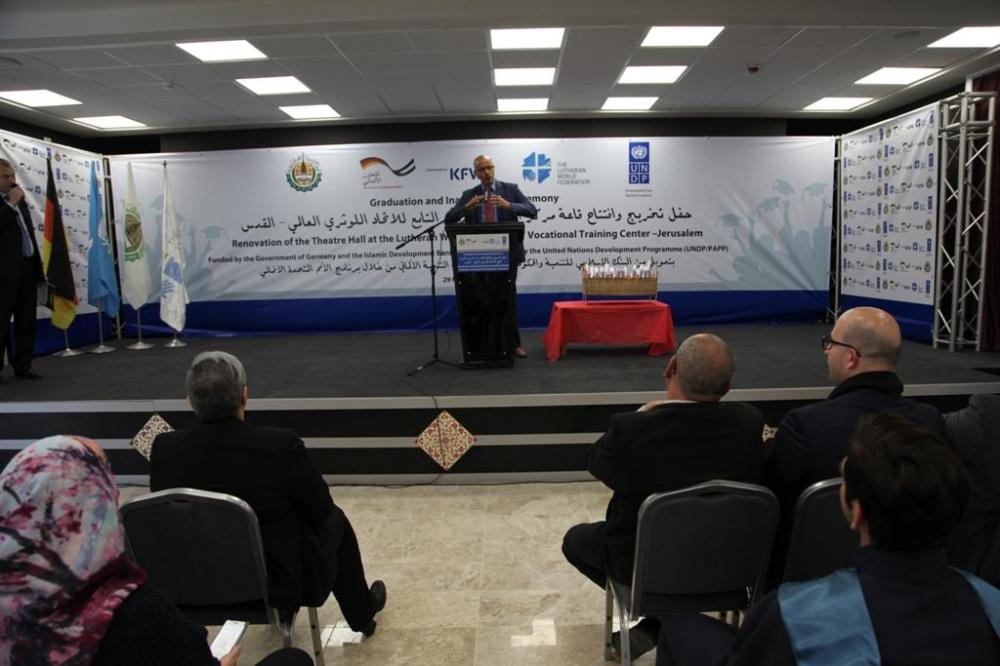 احتفل الاتحاد اللوثري العالمي، في مقره بالقدس بتخريج 106 من طلبة مركز التدريب المهني وافتتاح قاعة المركز الممولين من البنك الاسلامي للتنمية والحكومة الالمانية عبر بنك التنمية الالماني وبرنامج الامم المتحدة الإنمائي.