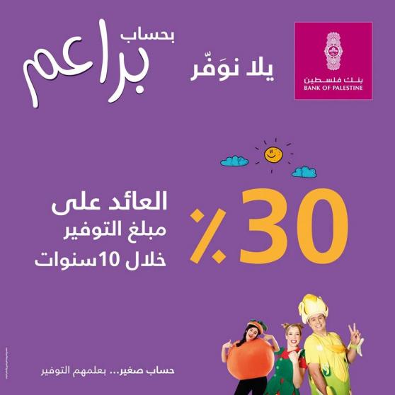 استمرارا لجهوده بطرح وتقديم خدمات ومنتجات مصرفية متميزة تغطي إحتياجات كافة الشرائح في المجتمع الفلسطيني، أطلق بنك فلسطين حملة كبيرة على برنامج حسابات الأطفال "براعم" وذلك بهدف تشجيع الآباء أو الأمهات على توفير مبلغ صغير شهرياً وايداعه في حسابات الأطفال، فيما يقوم البنك بمنح المدخرين شهرياً نسبة من المبلغ المدخر في نهاية الفترة الادخارية تصل الى 30% خلال عشر سنوات.