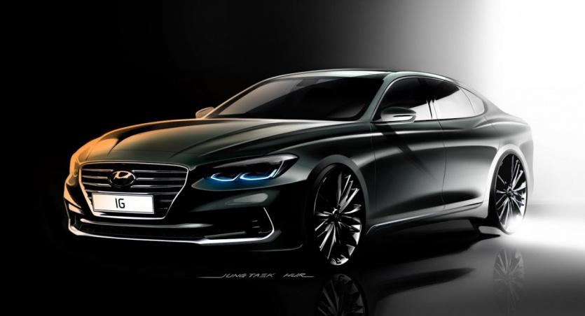 ويتميز تصميم سيارة السيدان الكبيرة بخطوط انسيابية متدفقة، وأشكال جذابة بسيطة تمثل تحديثاً شاملاً للمحاور البصرية الرئيسية التي تبدعها هيونداي. وتحمل مقدمة السيارة أكبر نسخة من الشبك الأمامي ذيالفتحات المتوالية المتراتبة والمُسمّى "كاسكيدينغ غريل" (الشبك متوالي الانحدار)، الذي يُعتبر أحدث عناصر التصميم في هيونداي ويفرض حضوراًجديداً واثقاً لعلامتها التجارية.