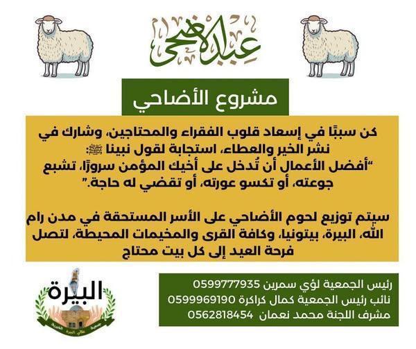 وعن مشروع الأضاحي السنوي، بيّن أنه يتم تجميع أكبر عدد ممكن من الأضاحي ليتم توزيعها على العائلات المتعففة المسجلة لدى الجمعية، ولكن في كل وقت يتم إضافة عائلات جديدة وتكون الأفضلية للعائلات الأكثر حاجة.